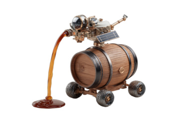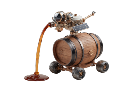 Intricate steampunk contraption with a liquid pour over a wooden barrel on wheels