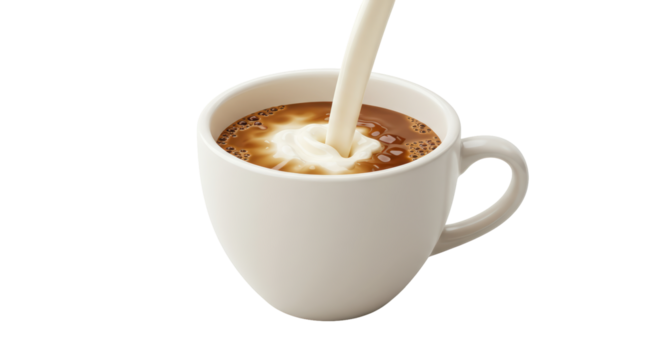 Coffee being poured from a pitcher into a white cup isolated on white background. Minimalistic and clean design concept of refreshment and simplicity