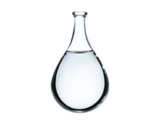 Clear glass flask filled with water on a white background