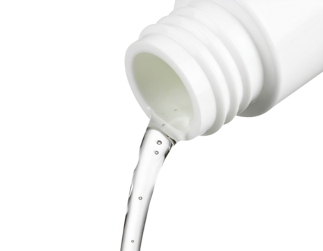 A close-up of a white bottle pouring a clear liquid, highlighting the flow and surface tension against a black background.