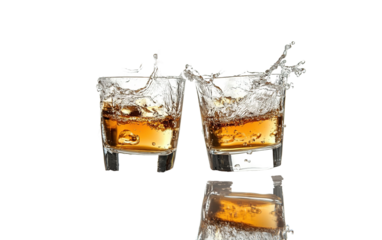 Glasses shot of tequila making toast with splash isolated on solid white background in Png form