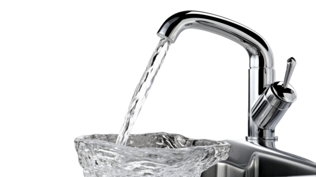 A high-speed shot of fresh water being poured into a transparent glass creating a dynamic splash isolated on transparent background