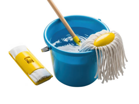 Blue bucket filled with clear water and a mop with white strings and a yellow handle next to a folded mop head with white fabric and yellow plastic on a black png isolated transparent background