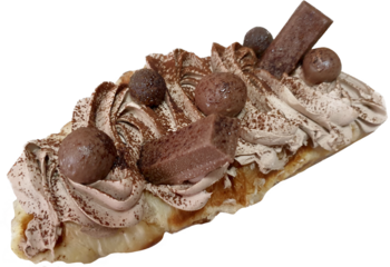 A decadent waffle pastry topped with swirls of chocolate mousse, dusted cocoa powder, crunchy chocolate balls, and rich chocolate bars. A true treat for chocolate lovers