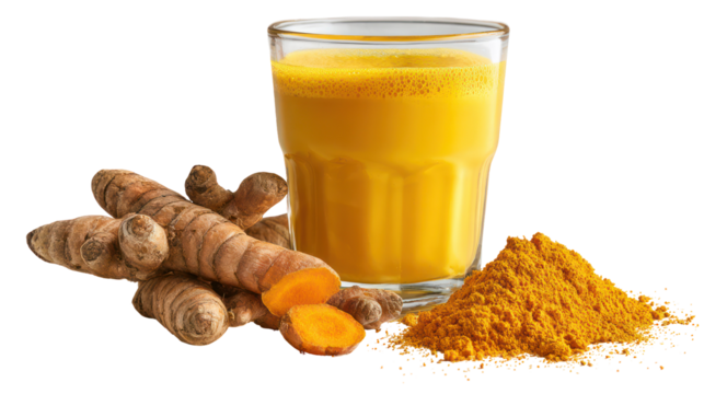 Golden turmeric milk in a glass with fresh roots and powder isolated on transparent background