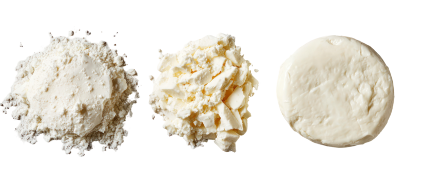 Three piles of white powdered sugar and butter isolated on transparent background