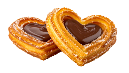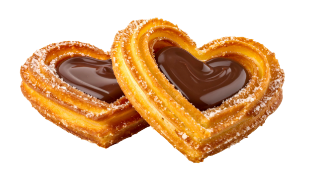 Two heart-shaped churros filled with chocolate, dusted with powdered sugar, set on black