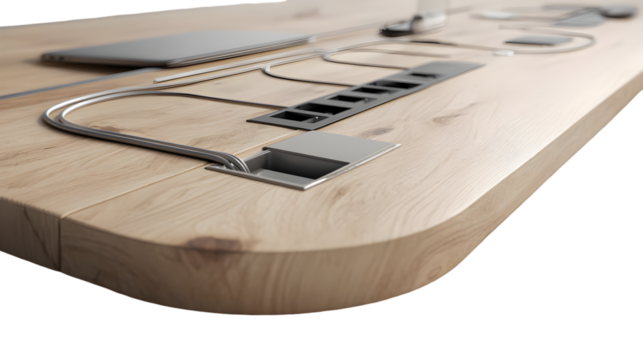 A close up of a light wood desk with a laptop and power outlets and cable management system on top