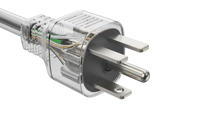 White electrical power plug connecting to a cable, providing energy and electricity, isolated with transparent background