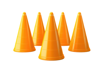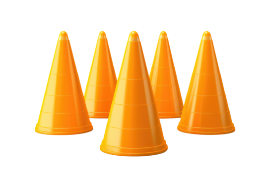 Four orange traffic cones in a row on transparent background