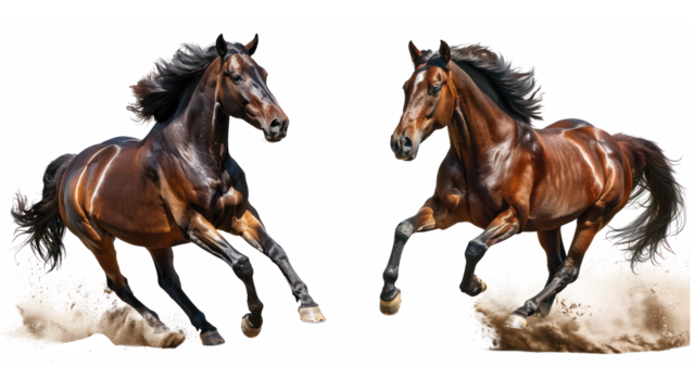 Set of Powerful Brown Horse Stallion Running with Flowing Mane, Isolated on Transparent Background