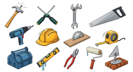 Various hand tools and power tools for construction and home improvement projects isolated on transparent background