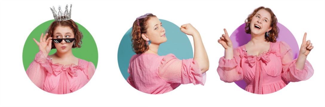 A beautiful, young woman showing off her strong muscles, shows with the fingers up dressed in pink. Different stickers, isolated on a white png background. Authentic girl.