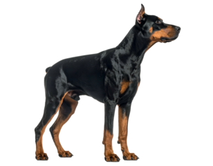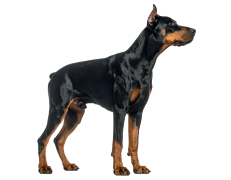 Sleek, black and tan canine, muscular build, alert pose