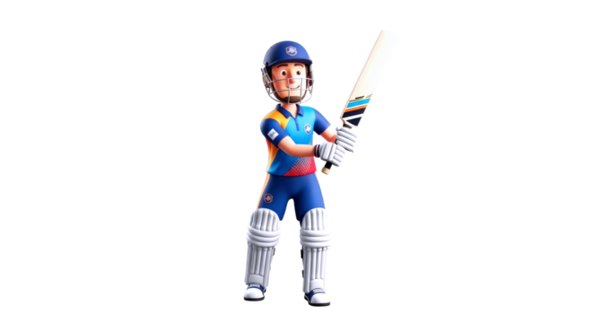 ready to smash 3d cartoon cricket player, powerful pose, dynamic action, game on, isolated on transparent background