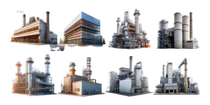 Industrial Power Plant Complex in Various Angles, PNG collection, set bundle, isolate on transparent or white background