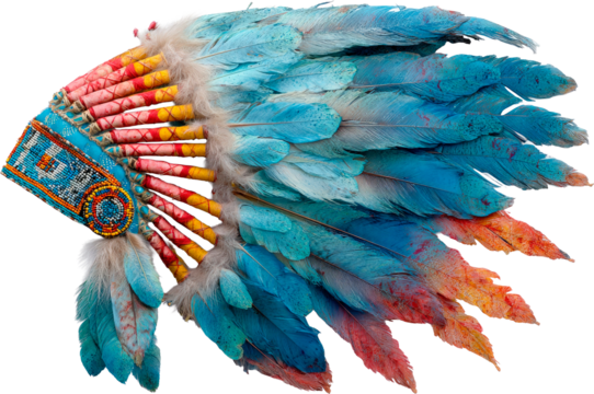 Traditional Native American feather headdress with vibrant blue, red, and yellow feathers, beadwork isolated on transparent background PNG, cultural heritage and ceremonial significance