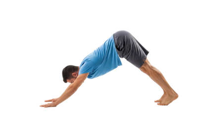 A man performing the downward-facing dog yoga position, stretching and engaging his entire body on a black surface.