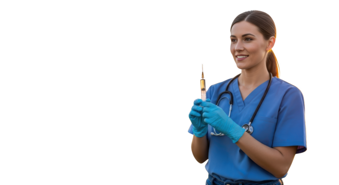 Female doctor holding syringe with protective gloves on white or transparent background.