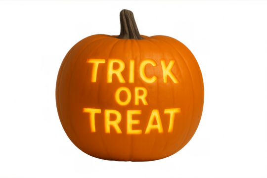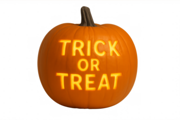 Stylized graphic illustration featuring a classic 'Trick or Treat' message embedded within a festive black pumpkin shape, perfect for Halloween celebrations, autumn events, and spooky season designs