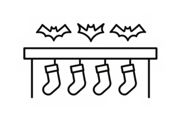 Spooky mantelpiece with bat decorations and hanging stockings combining halloween and christmas holiday themes