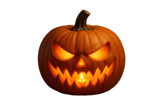Halloween pumpkin with illuminated scary face on transparent background