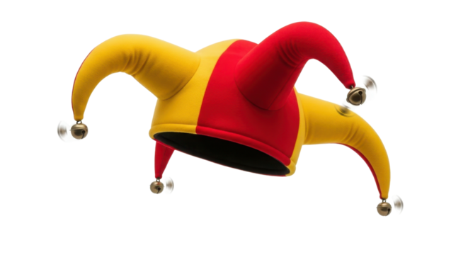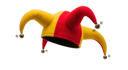 Traditional red and yellow jester hat with jingling bells, symbolizing comedy, fun, and fools. isolated PNG with Transparent Background