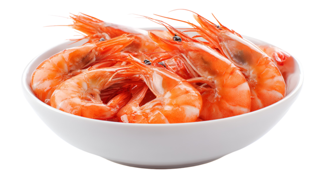 A white bowl filled with cooked pink shrimp isolated on transparent background