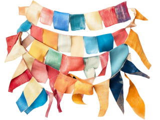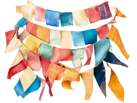 Colorful prayer flags strung together on a line creating a festive decorative banner isolated on transparent background