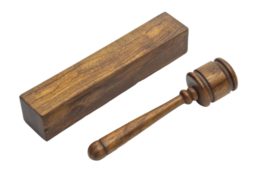 Antique brass prayer wheel and case isolated on transparent background. Wooden gavel and sound block isolated on white background.