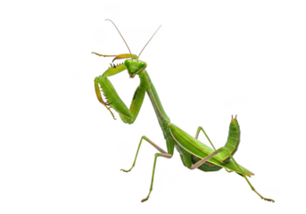 Green praying mantis insect with long legs and antennae isolated on a transparent background