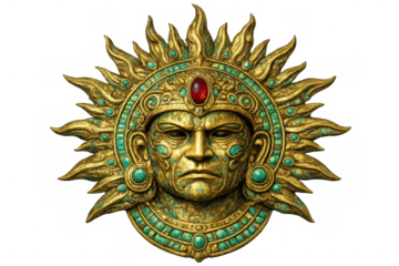 Aztec sun god tonatiuh symbol with sunrays, golden mask, and carved jade relief, pre-columbian deity mythology