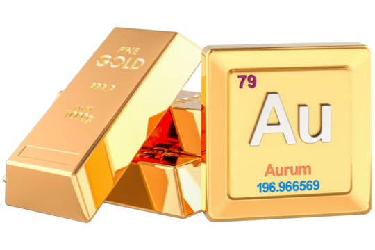Gold bullion bars with periodic table Au element, transparent background