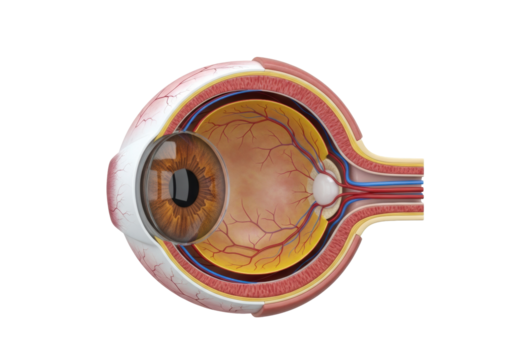 Hyper-detailed, medically accurate 3d cross-section of the human eyeball with visible retina, lens, optic nerve, and blood vessels on a transparent background. Concept of precise medical anatomy