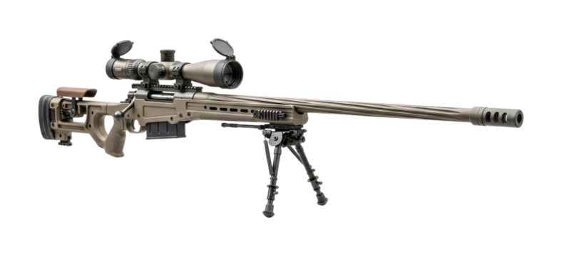 Modern black sniper rifle with scope and bipod isolated on transparent background