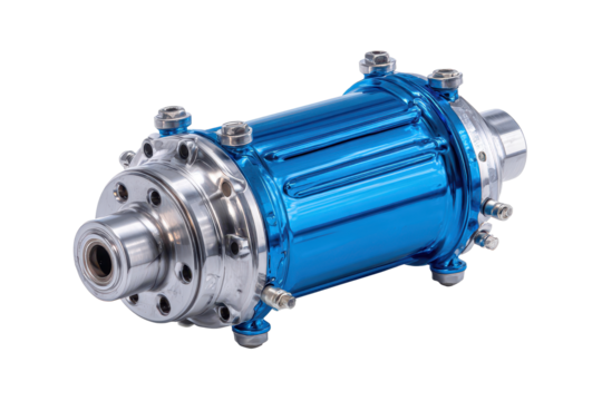 Blue metallic cylindrical engine component with machined grooves, bolt points, and realistic industrial surface wear details isolated on transparent background.