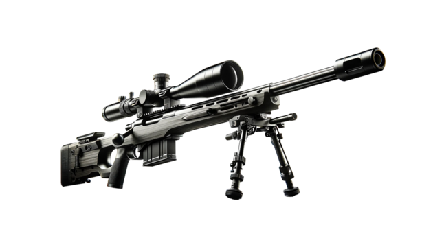 Sniper rifle gun  isolated on a white background. The rifle features a long, precision barrel, a high-powered scope, a sturdy stock, and detailed mechanica