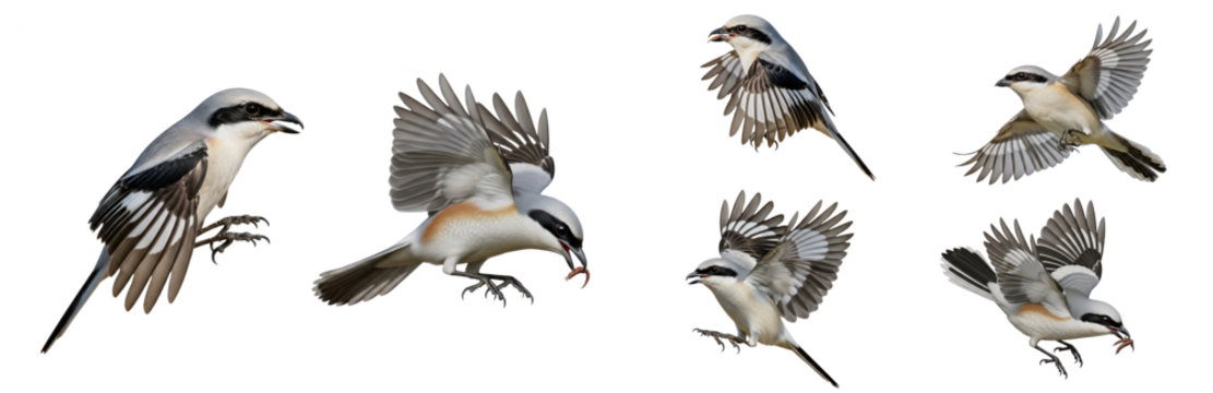 Loggerhead Shrike (Lanius ludovicianus) flight sequence, six birds, wings flapping, soaring, predatory bird, gray plumage, wildlife action, isolated on white.