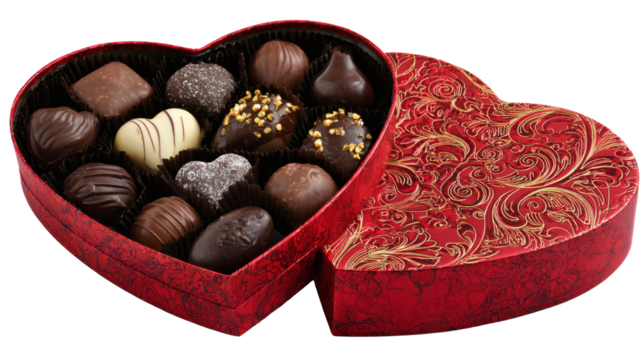 Valentine’s Day chocolate box opened with assorted chocolates, premium look, isolated on a white background