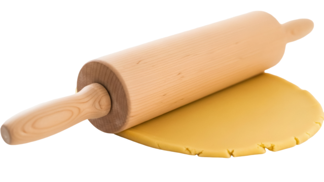 Wooden rolling pin on yellow dough isolated PNG, baking preparation for homemade pastry and cookies on transparent background
