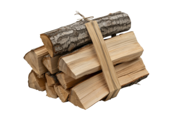 A neat stack of firewood logs, both split and one with bark, bound together with twine, against a transparent background. background removed