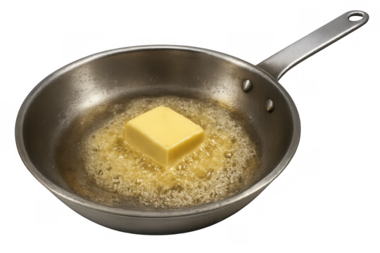Butter block melting in a hot pan, preparing cooking oil for frying food on isolated transparent background