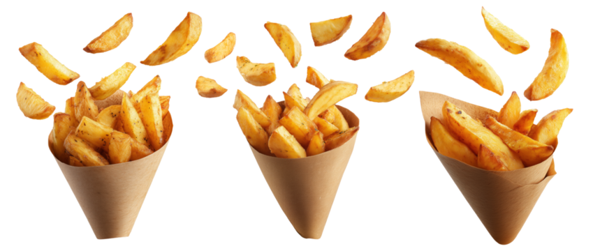 Batata Harra spicy potato wedges seasoned with herbs, garlic, chili served in brown paper cone, isolated on white background