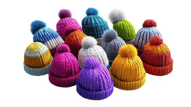 Colorful knitted hats with pom poms, isolated on transparent background