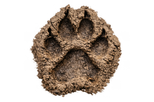 Dog paw print in mud creating a clear track, showing animal wildlife presence on transparent background