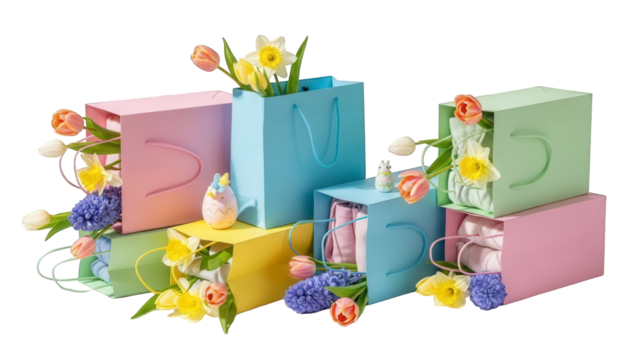 Colorful paper bags with flowers and gifts for easter celebration isolated on transparent background