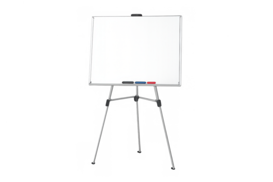 Whiteboard on easel stand with markers on a transparent background, ready for presentation and brainstorming concepts