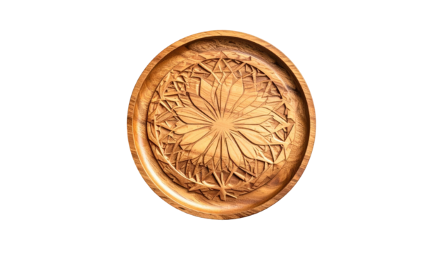 Close-up studio shot of a circular wooden tray featuring an intricate carved floral pattern