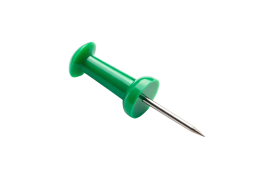 Green thumbtack shown horizontally with extended metal pin and dual plastic caps for secure posting, isolated on a transparent background