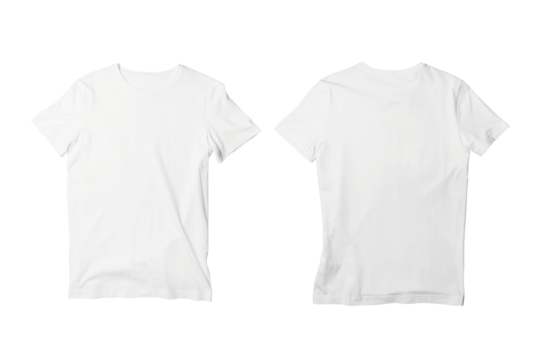 Set of White t shirt front and back on transparent background cutout, PNG file. Mockup template for product presentation.
